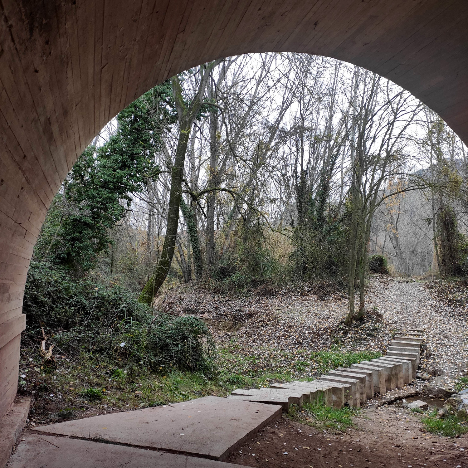 La construció del gual respon a la necessitat de permetre la connexió del recorregut per l’Anella Verda de Manresa que enllaça el riu Cardener amb la zona de Can Poc Oli. El gual es preveu amb prismes de formigó que ressegueixen, amb una disposició capritxosa, el recorregut.